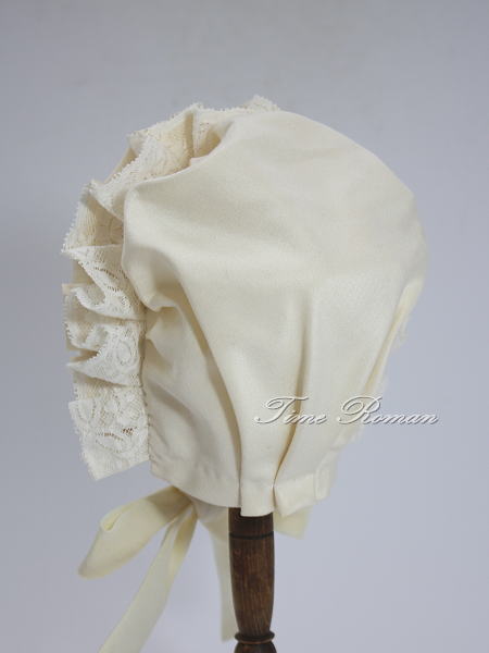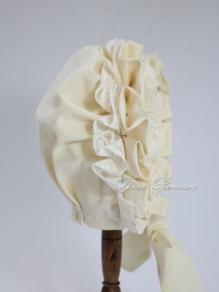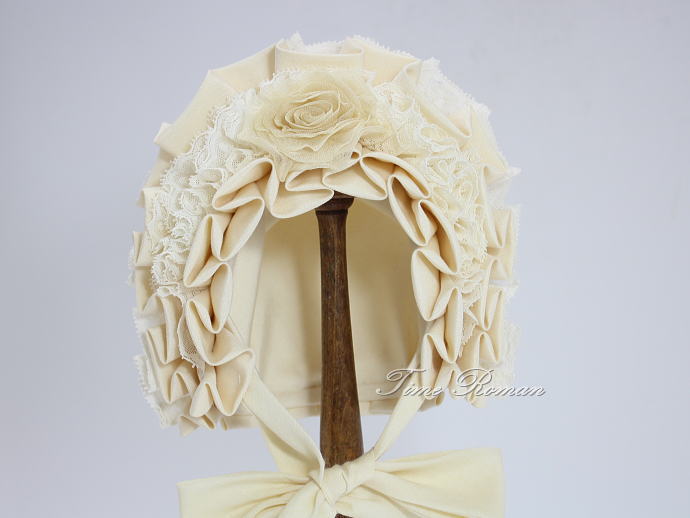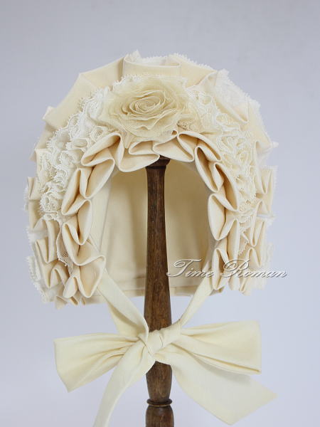 フランス製リバーレース、ラッセルレース、シルクオーガンジーの花があしらわれた可愛らしいボンネットです。