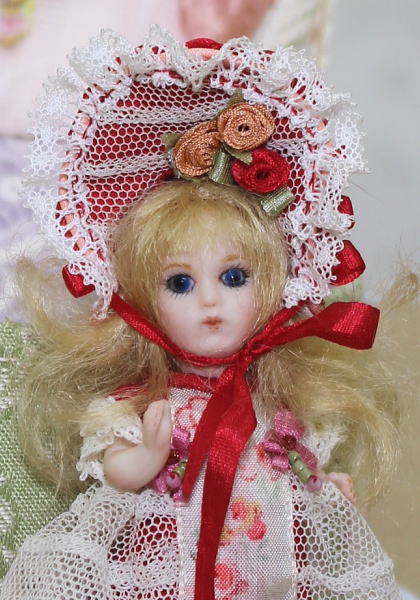 赤のシルク生地に可愛らしくアンティークレースを飾ったお洋服とお帽子。