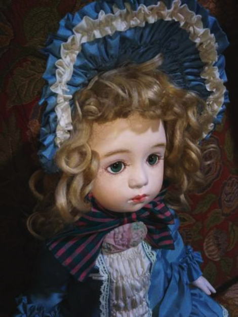 ブルーのボンネットにレースをふんだんにあしらったドレスを身にまとい。