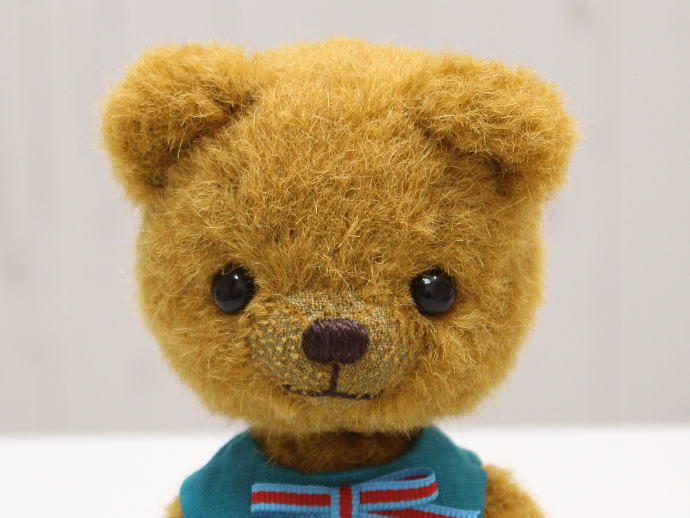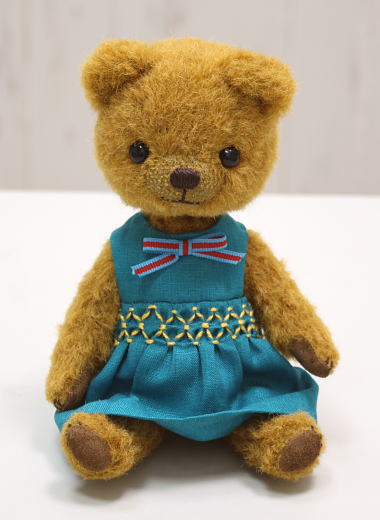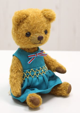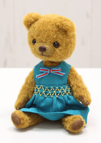 テディベア&アニマル・アーティスト「hanahana/松原美香」さま作のテディベア『no.186 テディベアみどりのワンピース』。