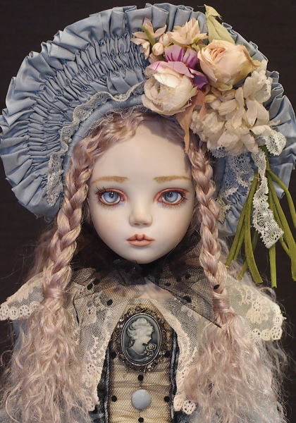 美しく光沢のある淡いブルーのドレスとボンネットは、少女に大変良く似合っております。