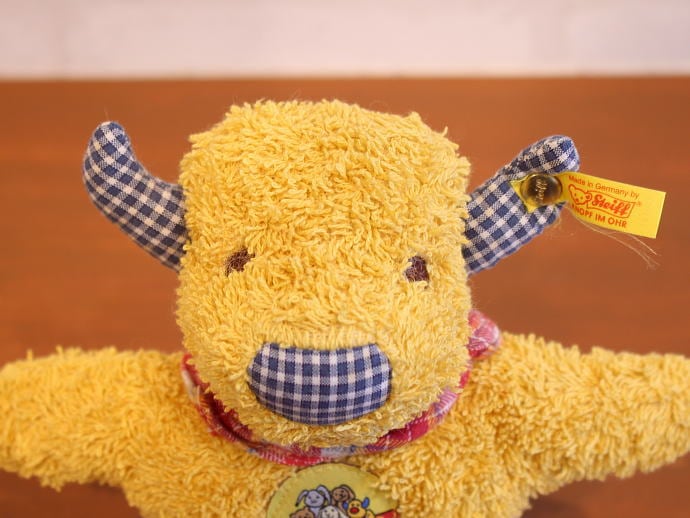 耳のボタンイヤー及びリボンと胸にシュタイフ社のマークがあります。