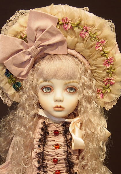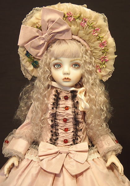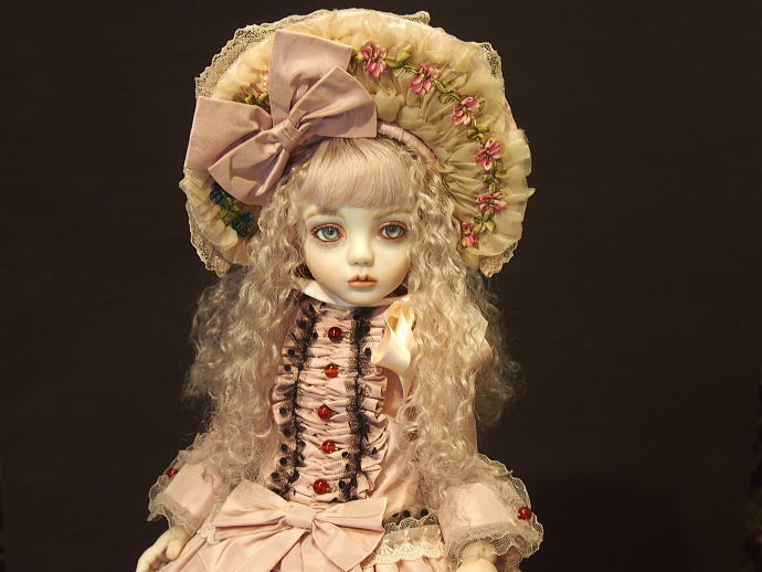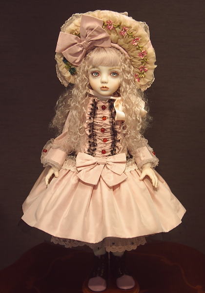美しく光沢のある上品な淡いピンクドレスとボンネットは、少女に大変良く似合っております。