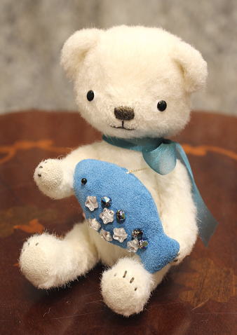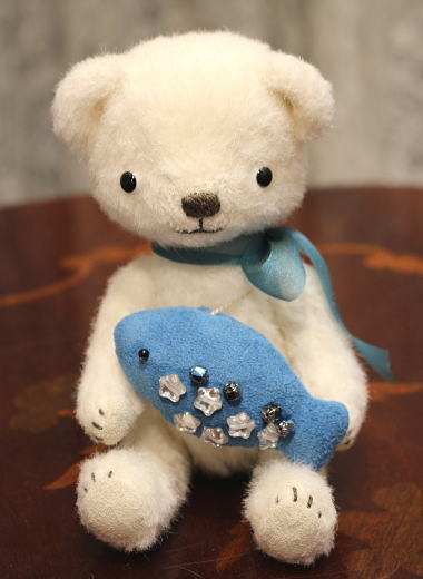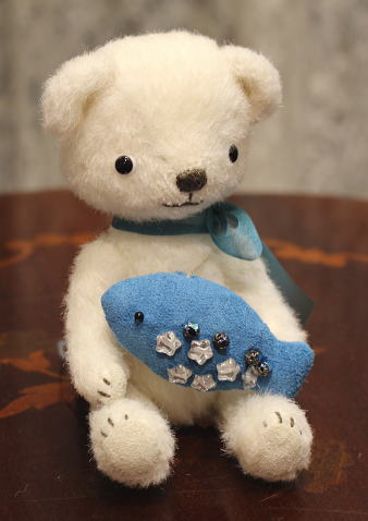 テディベア&アニマル・アーティスト「hanahana/松原美香」さま作のテディベア 【no.222 お魚獲れた白くまちゃん】。