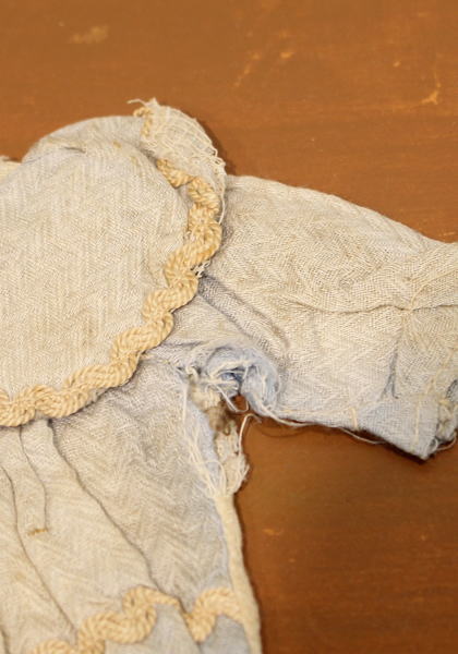 こちらのドレスは大変古いものですので、後ろ開閉部分の留め具がありません。また布地の破れ、裂け、シミがあります。予めご了承ください。