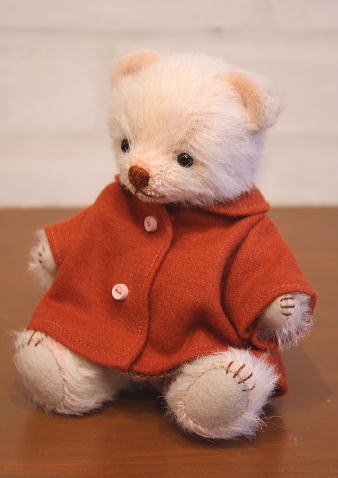 茶色みかかったオレンジの丸襟コートは、ベアちゃんに大変良く似合っております。