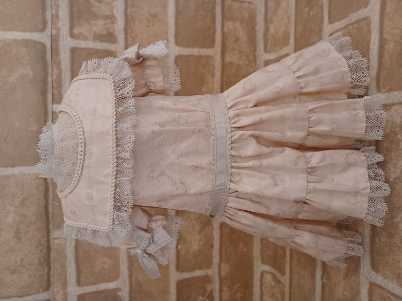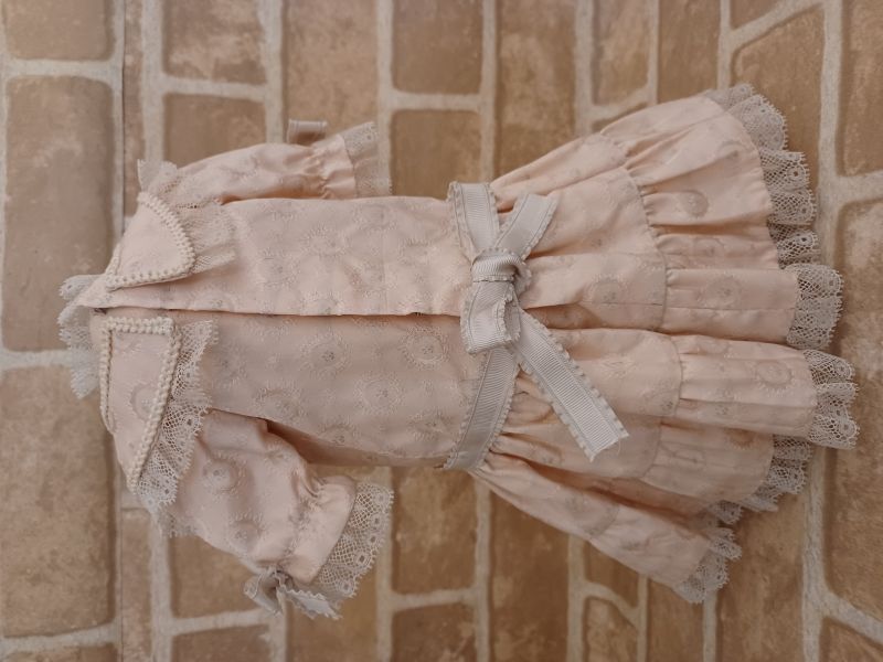 上品な美しいピンク色と繊細なアンティークレースが映えるワンピースとは、袖口のリボンがワンポイントとなっております。