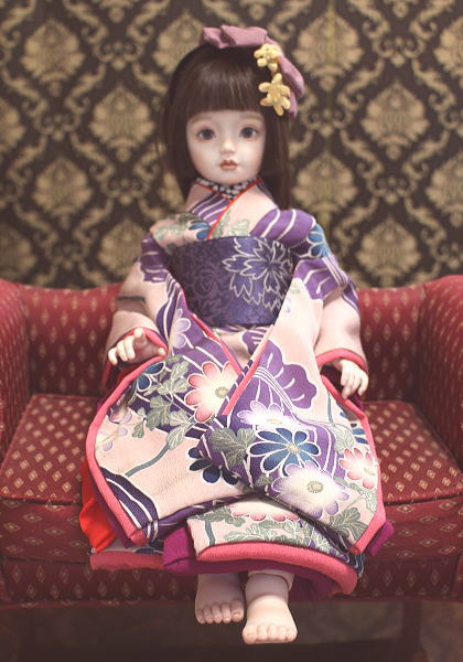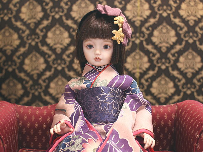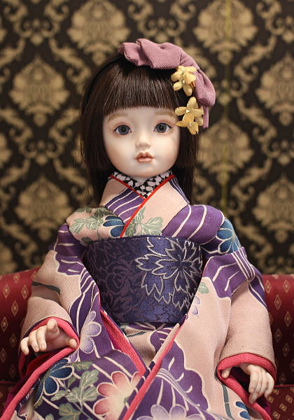 紫を基調とした華やかな着物に身を包みふっくらとした唇が大変愛らしいです。