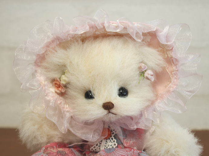 淡いピンクのレースの付いたボンネットと花柄のドレスが大変良く似合う素敵な子です。