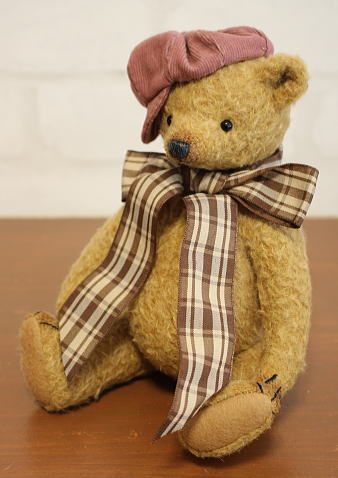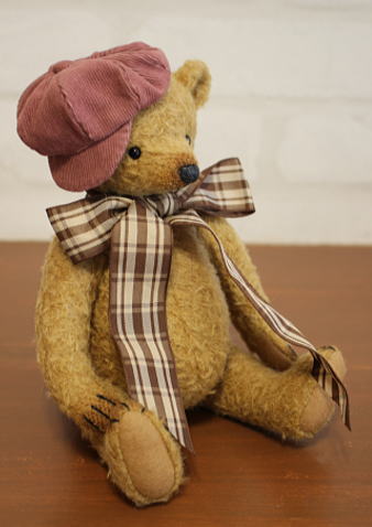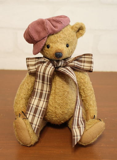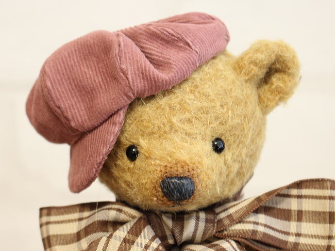 コーデュロイのキャストケットとチェックのリボンが大変よく似合うベアちゃんです♪