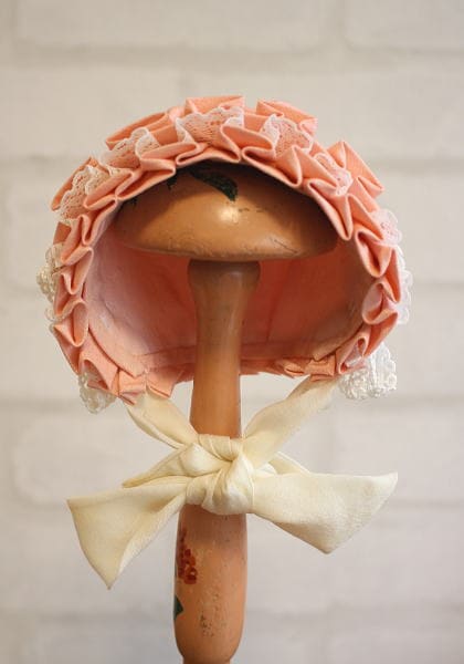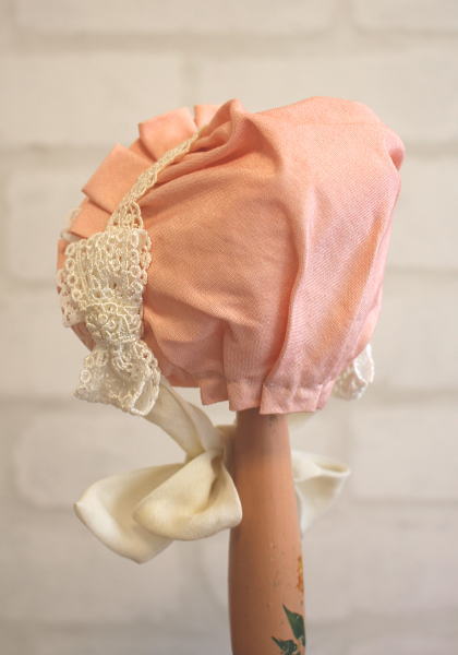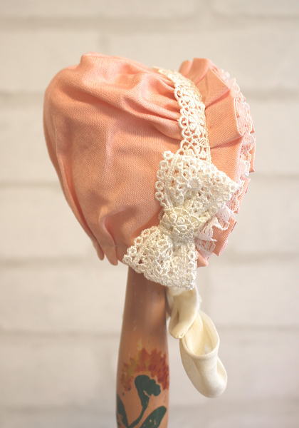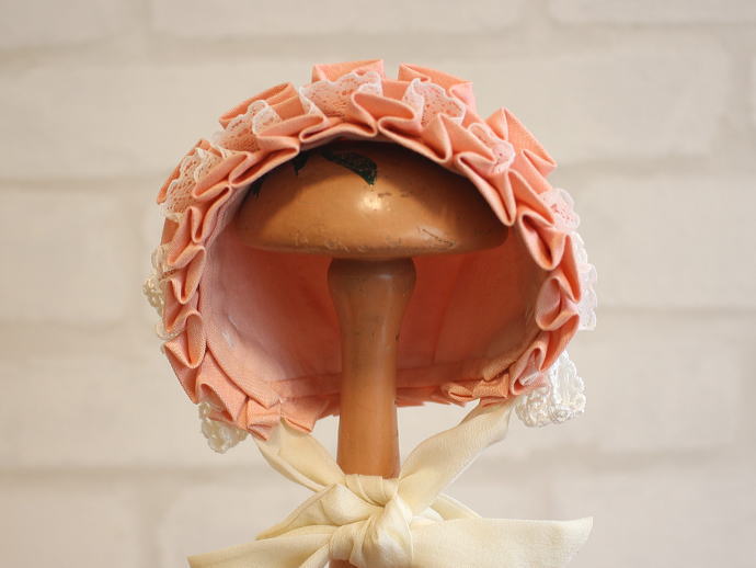 ピンク色に細やかなレースが施された、可愛らしいデザインのボンネットです。