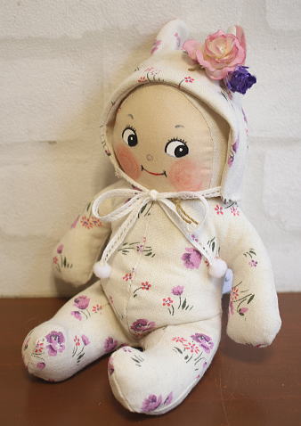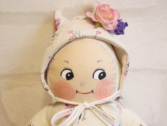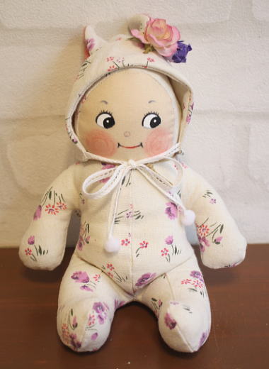 小さな花々が散りばめられた柄のボディに、ひょっこりとウサギの耳がついた帽子と