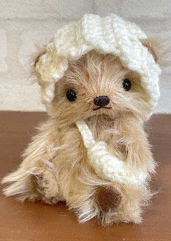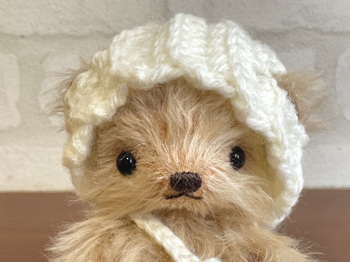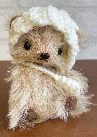 手編みのポシェットと耳だし帽子がおしゃれで、ベアちゃんにとても似合っております。