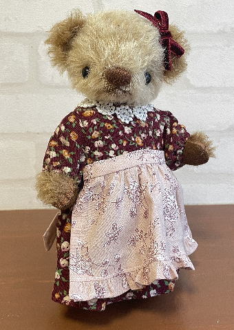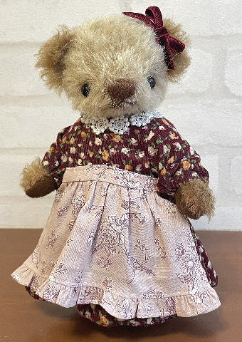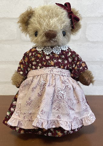 赤の花柄ワンピースに、ピンク色のエプロンは、華やかなベアちゃんに大変似合っております。