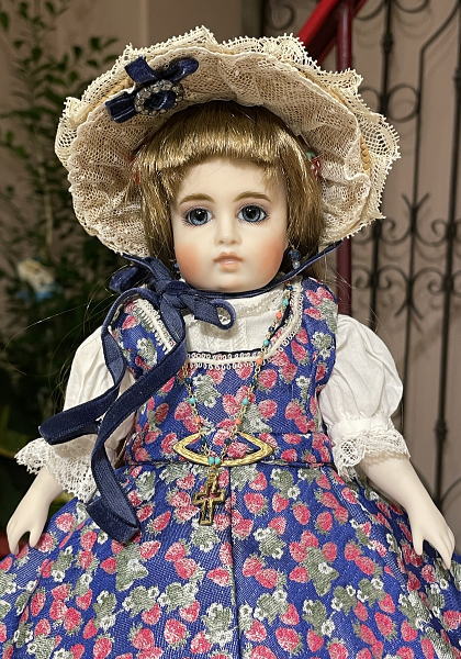青色にイチゴの柄が散りばめられた上品なドレスと、繊細なレースがふんだんに施されたボンネットが