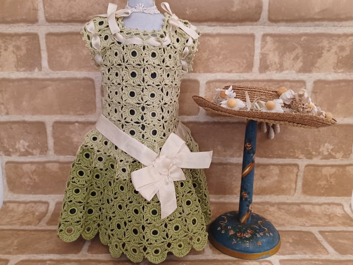ドール関連品 I > ドレス > ドール用サイズ 作家1点もの【クロシェット・ドレス+帽子のセット】