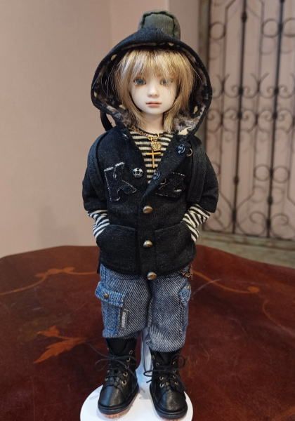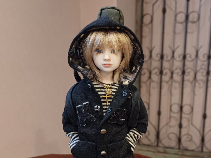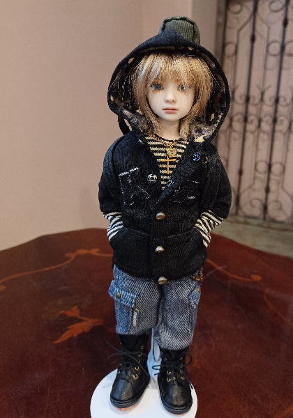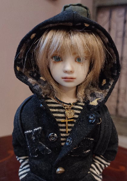 美しいビスク肌に艶やかなブロンドの髪、ふっくらとした血色の良い唇に目元の泣きぼくろがとてもチャーミングな少年です。