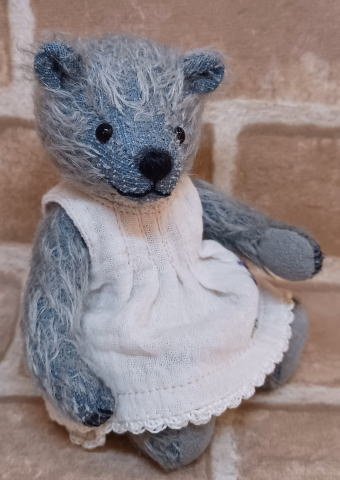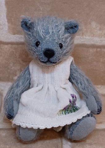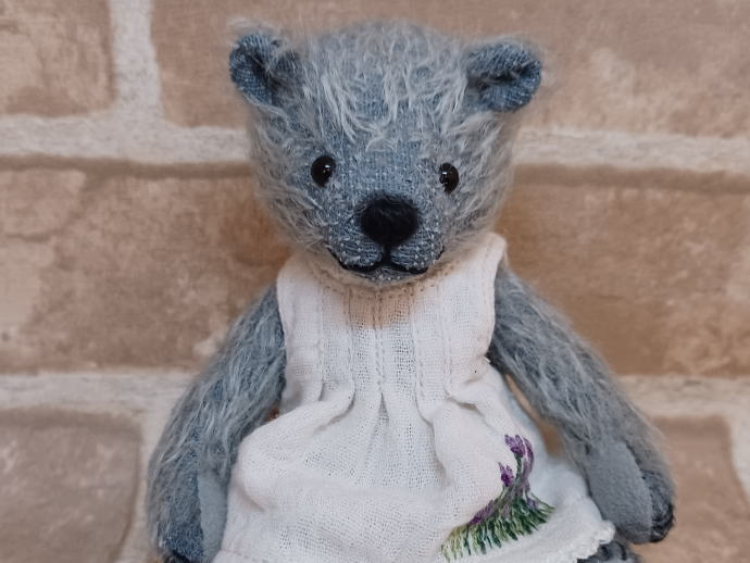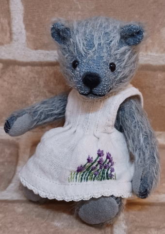 テディベア・アーティスト「nfb」さま作の【ブルーベア(ラベンダー刺繍)】。