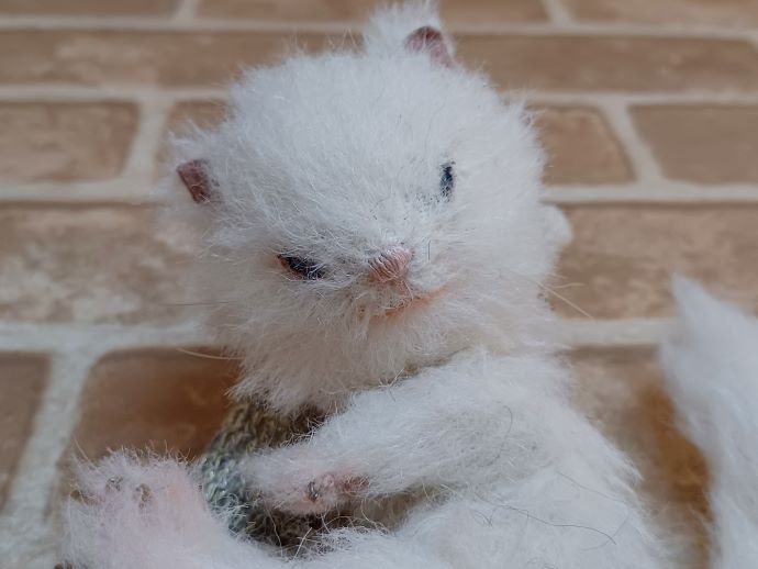 手編みのキノコを枕にして眠る白い子猫です。
