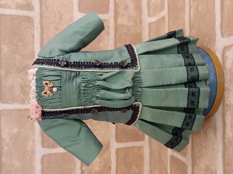 高級感のある艶やかなグリーンのシルクタフタに映える、黒のブレードとリバーレースが上品なワンピース。